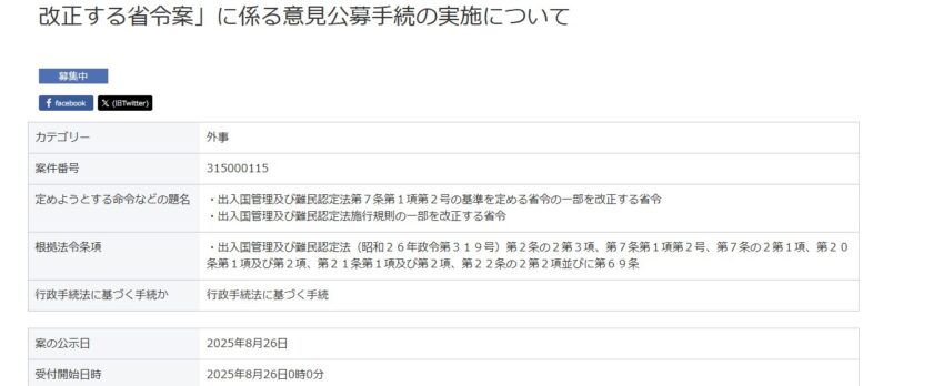 出入国在留管理庁は、在留資格「経営・管理」の審査基準見直しに関する省令改正案を公表し、パブリックコメント(意見募集)を開始しました。